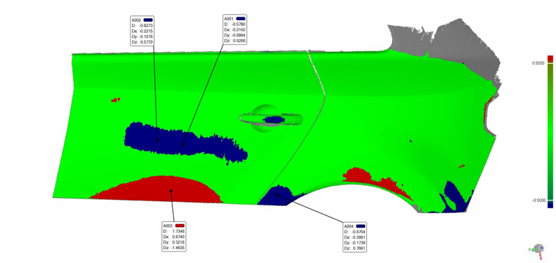 解決方案:HSCAN手持式三維掃描儀。通過手持式三維掃描儀對故障車的撞擊部位車身進行激光掃描,獲取車身的三維數(shù)據(jù),與同類車型的正常車身三維數(shù)據(jù)進行比對,得到撞擊車身的偏差值。